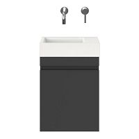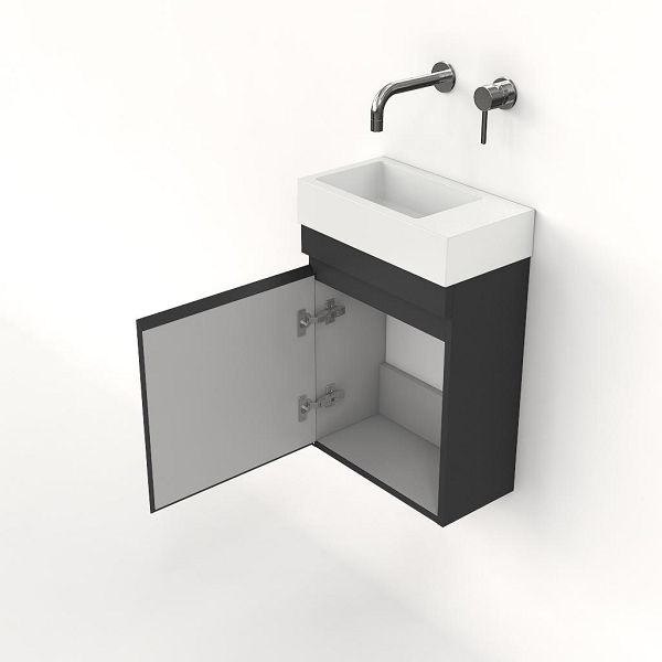 Greeploos fonteinmeubel in de kleur antraciet mat is 40 cm breed. De wastafel is vervaardig in polystone en heeft de kleur wit polystone met 0 kraangaten