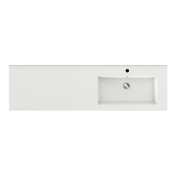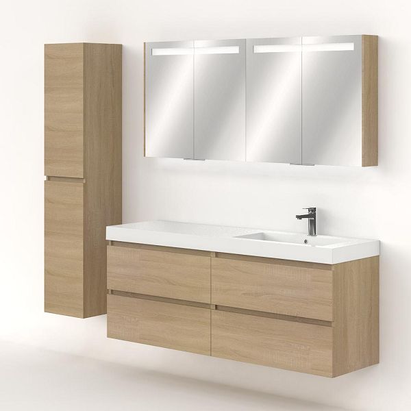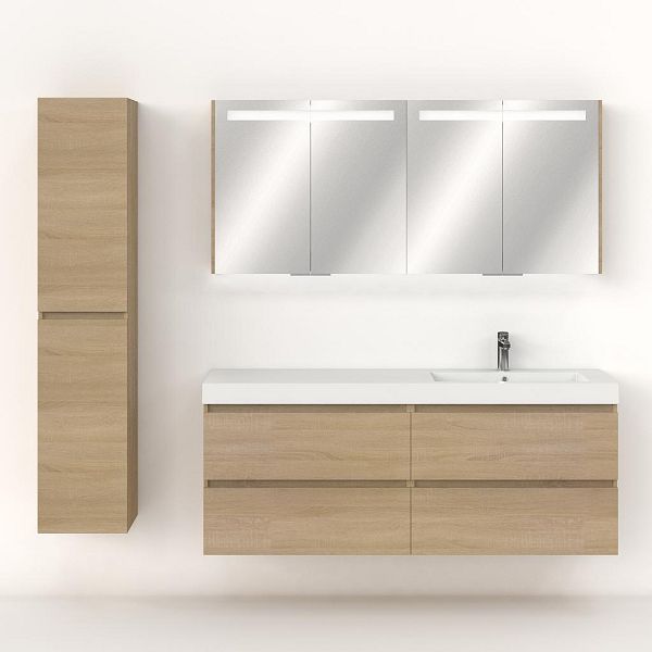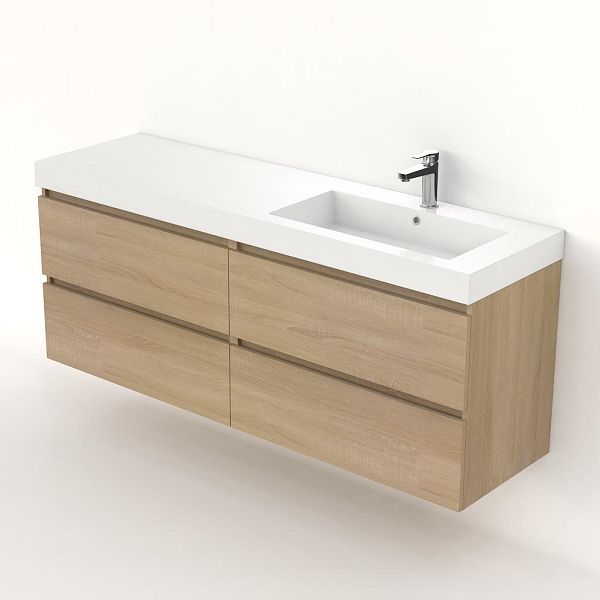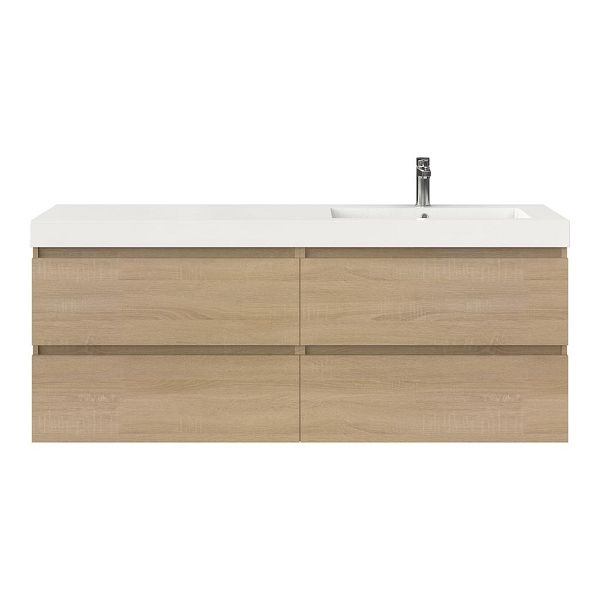 Greeploos badkamermeubel in de kleur eiken licht is 160 cm breed. De wastafel is vervaardig in polystone en heeft de kleur wit. Dit badkamermeubel met deze wastafel is leverbaar tussen de 60 cm t/m 200 cm
