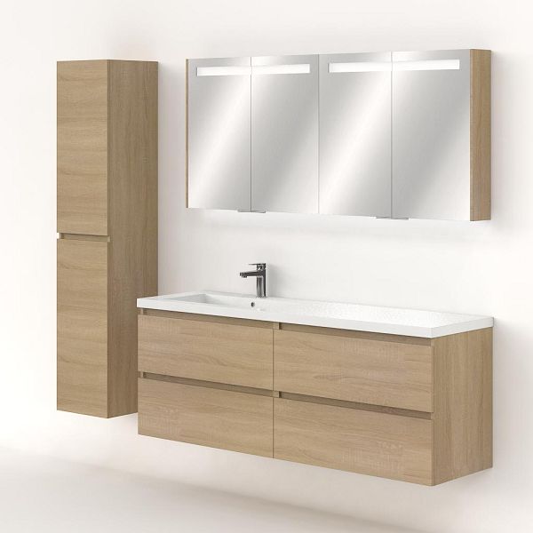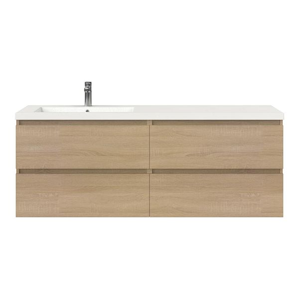 Greeploos badkamermeubel in de kleur eiken licht is 160 cm breed. De wastafel is vervaardig in polystone en heeft de kleur wit. Dit badkamermeubel met deze wastafel is leverbaar tussen de 60 cm t/m 200 cm