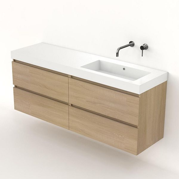 Greeploos badkamermeubel in de kleur eiken licht is 160 cm breed. De wastafel is vervaardig in polystone en heeft de kleur wit. Dit badkamermeubel met deze wastafel is leverbaar tussen de 60 cm t/m 200 cm