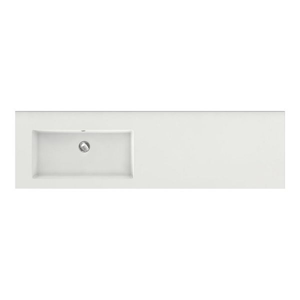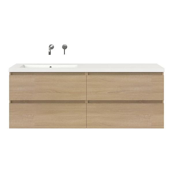 Greeploos badkamermeubel in de kleur eiken licht is 160 cm breed. De wastafel is vervaardig in polystone en heeft de kleur wit. Dit badkamermeubel met deze wastafel is leverbaar tussen de 60 cm t/m 200 cm