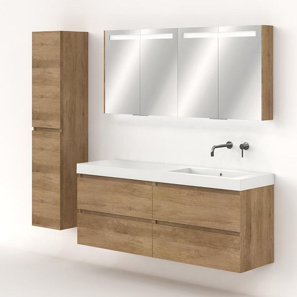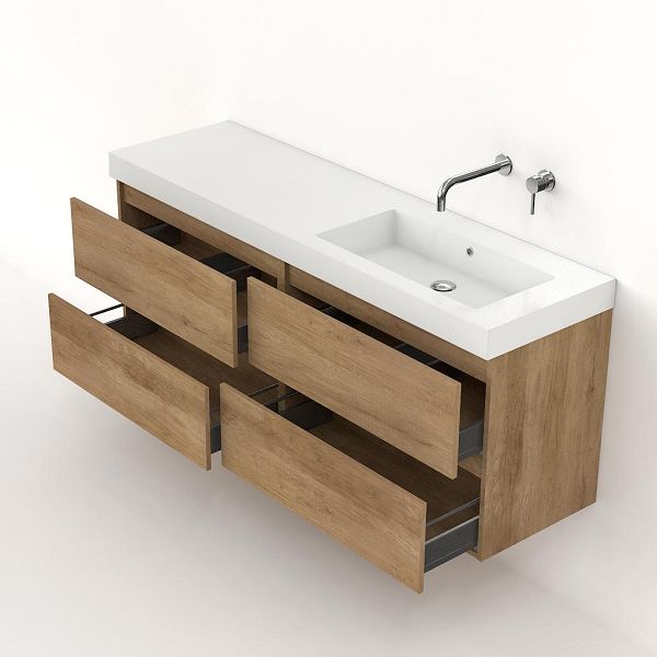 Greeploos badkamermeubel in de kleur olm is 160 cm breed. De wastafel is vervaardig in polystone en heeft de kleur wit. Dit badkamermeubel met deze wastafel is leverbaar tussen de 60 cm t/m 200 cm