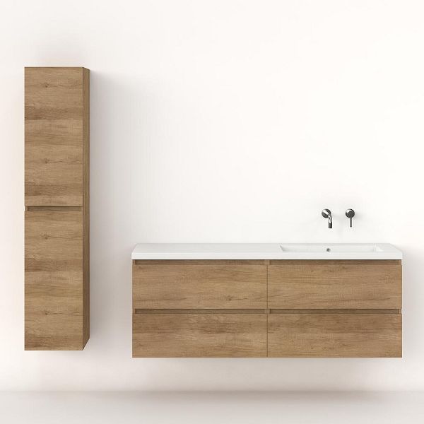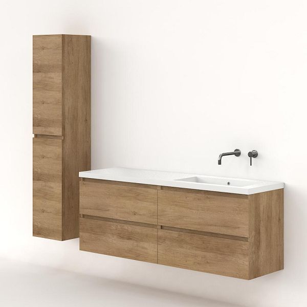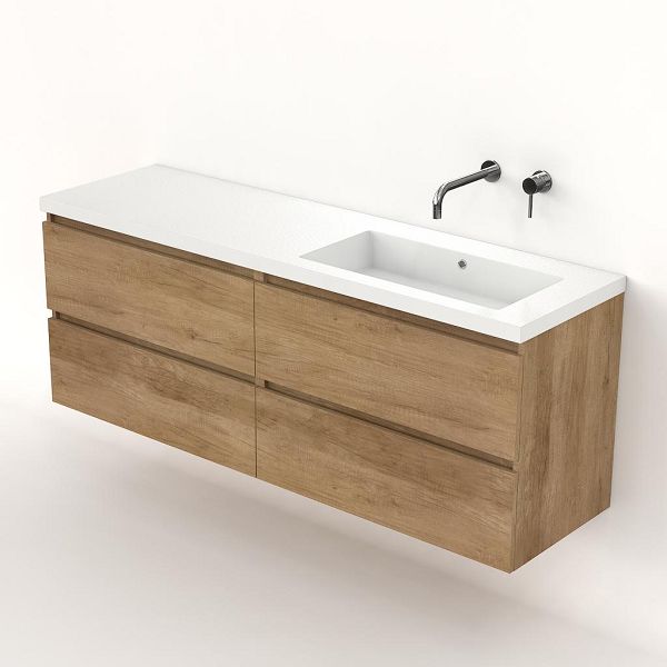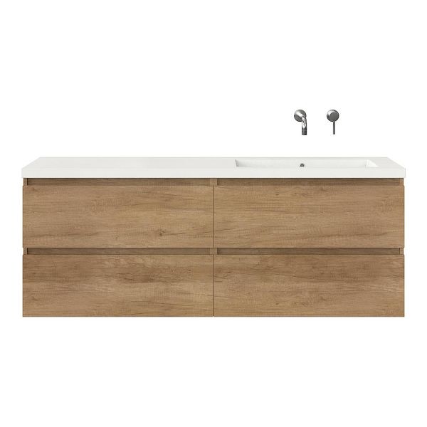Greeploos badkamermeubel in de kleur olm is 160 cm breed. De wastafel is vervaardig in polystone en heeft de kleur wit. Dit badkamermeubel met deze wastafel is leverbaar tussen de 60 cm t/m 200 cm