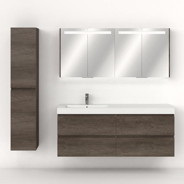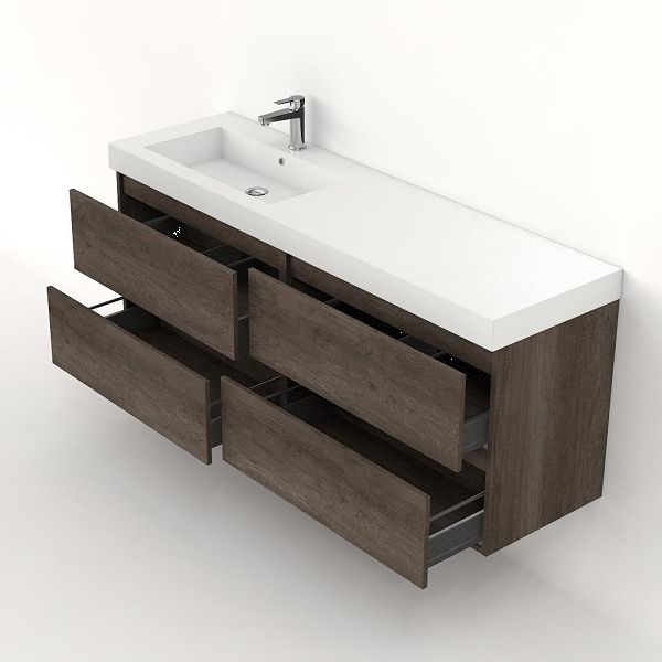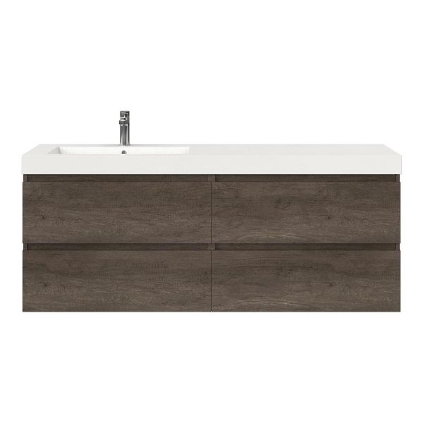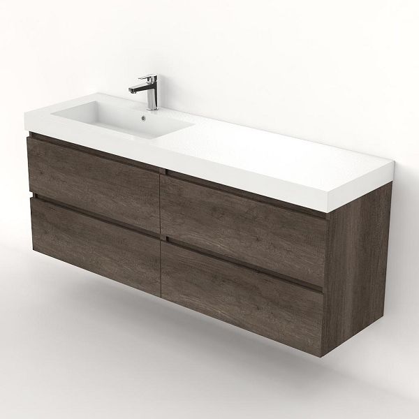 Greeploos badkamermeubel in de kleur olm donker grijs is 160 cm breed.  De wastafel is vervaardig in polystone en heeft de kleur wit. Dit badkamermeubel met deze wastafel is leverbaar tussen de 60 cm t/m 200 cm