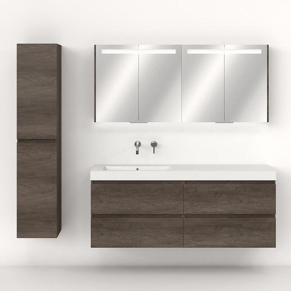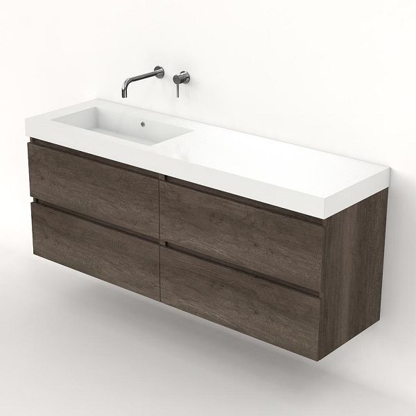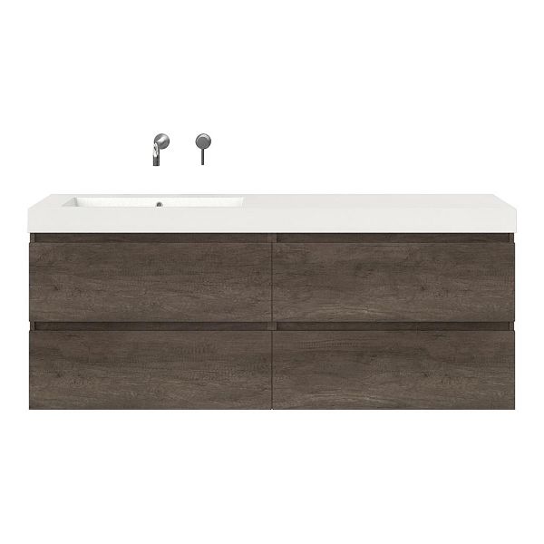 Greeploos badkamermeubel in de kleur olm donker grijs is 160 cm breed.  De wastafel is vervaardig in polystone en heeft de kleur wit. Dit badkamermeubel met deze wastafel is leverbaar tussen de 60 cm t/m 200 cm