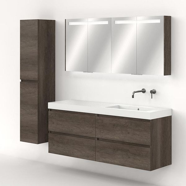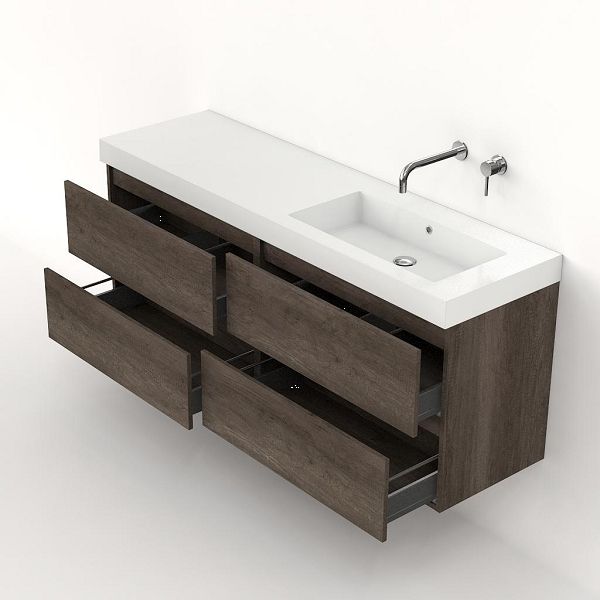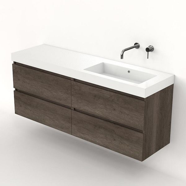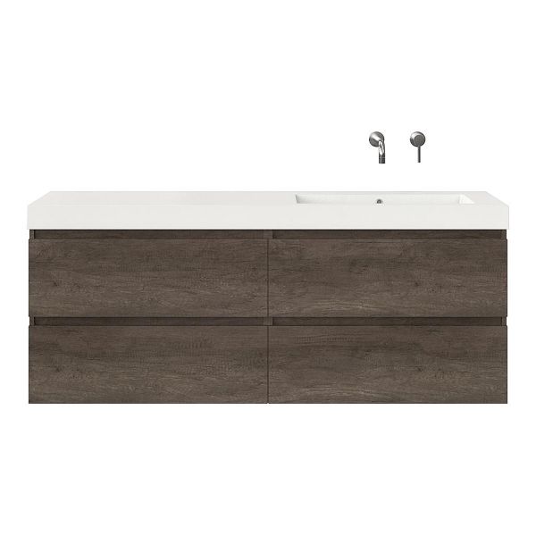 Greeploos badkamermeubel in de kleur olm donker grijs is 160 cm breed. De wastafel is vervaardig in polystone en heeft de kleur wit. Dit badkamermeubel met deze wastafel is leverbaar tussen de 60 cm t/m 200 cm