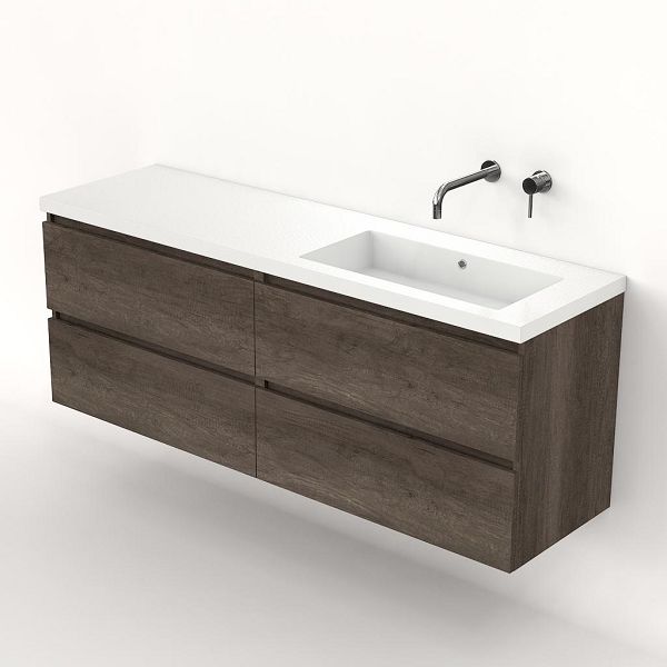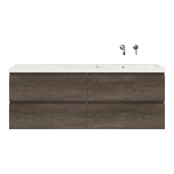 Greeploos badkamermeubel in de kleur olm donker grijs is 160 cm breed.  De wastafel is vervaardig in polystone en heeft de kleur wit. Dit badkamermeubel met deze wastafel is leverbaar tussen de 60 cm t/m 200 cm