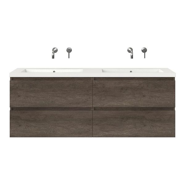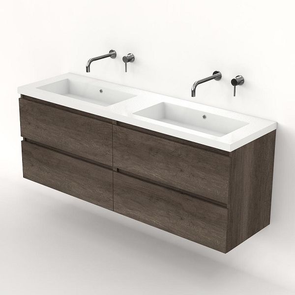 Greeploos badkamermeubel in de kleur olm donker grijs is 160 cm breed.  De wastafel is vervaardig in polystone en heeft de kleur wit. Dit badkamermeubel met deze wastafel is leverbaar tussen de 60 cm t/m 200 cm