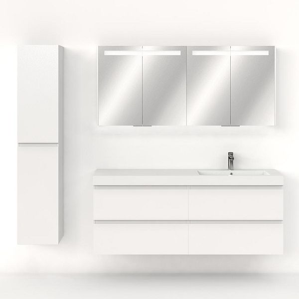 Greeploos badkamermeubel in de kleur wit hoogglans is 160 cm breed. De wastafel is vervaardig in polystone en heeft de kleur wit. Dit badkamermeubel met deze wastafel is leverbaar tussen de 60 cm t/m 200 cm