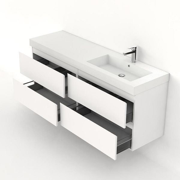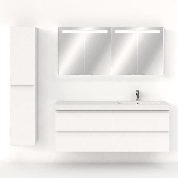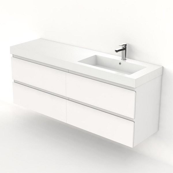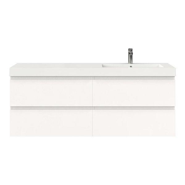 Greeploos badkamermeubel in de kleur wit mat is 160 cm breed. De wastafel is vervaardig in polystone en heeft de kleur wit. Dit badkamermeubel met deze wastafel is leverbaar tussen de 60 cm t/m 200 cm