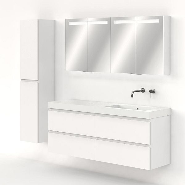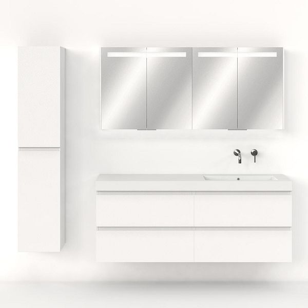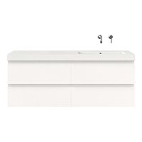 Greeploos badkamermeubel in de kleur wit mat is 160 cm breed. De wastafel is vervaardig in polystone en heeft de kleur wit. Dit badkamermeubel met deze wastafel is leverbaar tussen de 60 cm t/m 200 cm