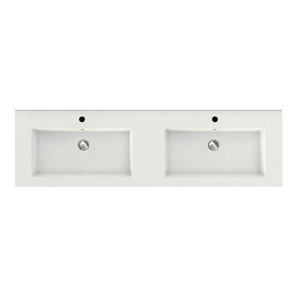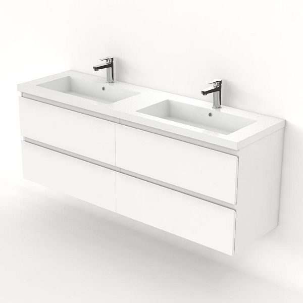 Greeploos badkamermeubel in de kleur wit mat is 160 cm breed. De wastafel is vervaardig in polystone en heeft de kleur wit. Dit badkamermeubel met deze wastafel is leverbaar tussen de 60 cm t/m 200 cm