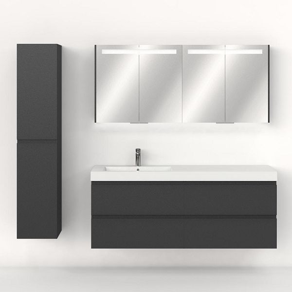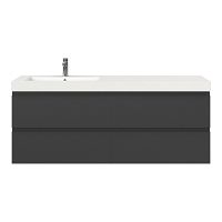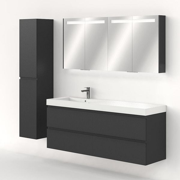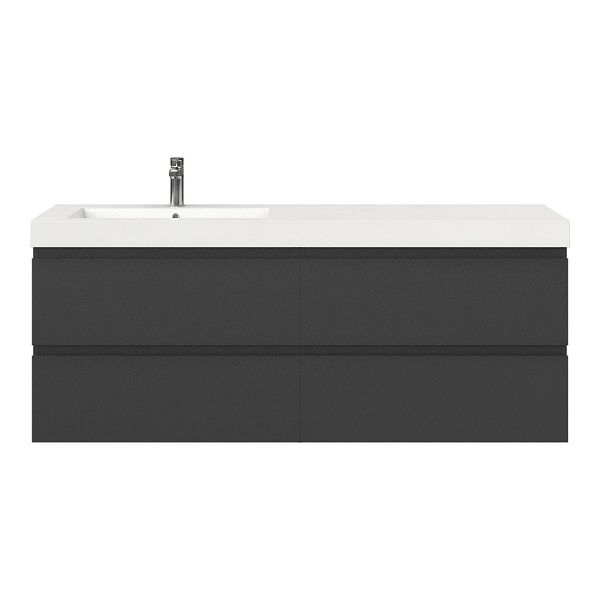 Greeploos badkamermeubel in de kleur antraciet mat is 160 cm breed.  De wastafel is vervaardig in polystone en heeft de kleur wit. Dit badkamermeubel met deze wastafel is leverbaar tussen de 60 cm t/m 200 cm