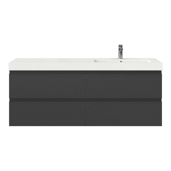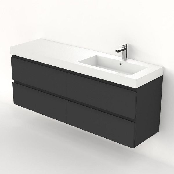 Greeploos badkamermeubel in de kleur antraciet mat is 160 cm breed. De wastafel is vervaardig in polystone en heeft de kleur wit. Dit badkamermeubel met deze wastafel is leverbaar tussen de 60 cm t/m 200 cm