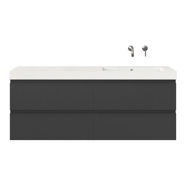 Greeploos badkamermeubel in de kleur antraciet mat is 160 cm breed. De wastafel is vervaardig in polystone en heeft de kleur wit. Dit badkamermeubel met deze wastafel is leverbaar tussen de 60 cm t/m 200 cm