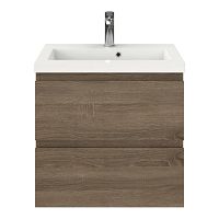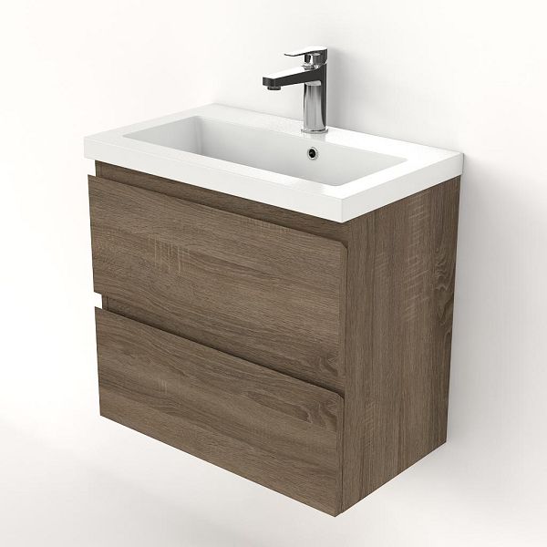 Ondiepe greeploos badkamermeubel in de kleur eiken donker. Badmeubel is praktisch voor een compact badkamer. Het meubel van 60 cm breed is er.  De wastafel is vervaardig in polystone en heeft de kleur wit. Dit badkamermeubel met deze wastafel is leverbaar tussen de 60 cm t/m 120 cm.