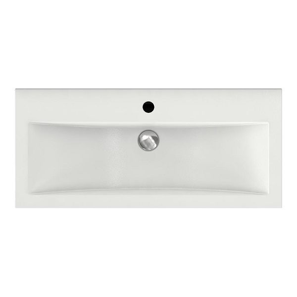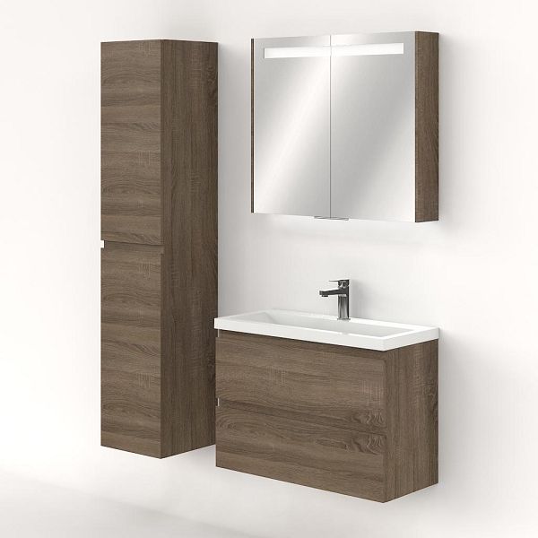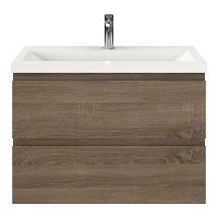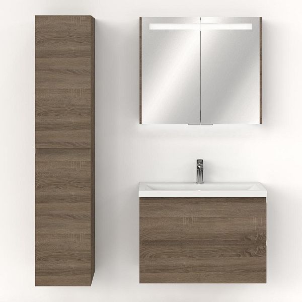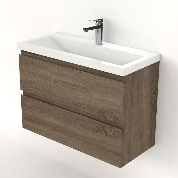 Ondiepe greeploos badkamermeubel in de kleur eiken donker. Badmeubel is praktisch voor een compact badkamer. Het meubel van 80 cm breed is er. De wastafel is vervaardig in polystone en heeft de kleur wit. Dit badkamermeubel met deze wastafel is leverbaar tussen de 60 cm t/m 100 cm.