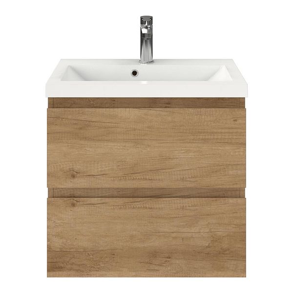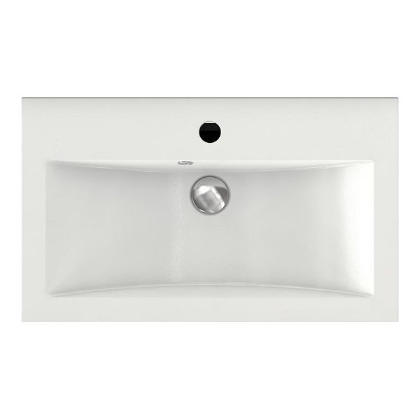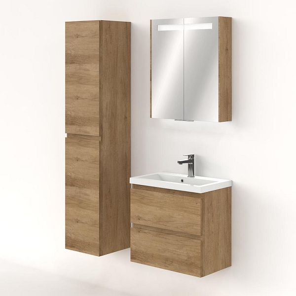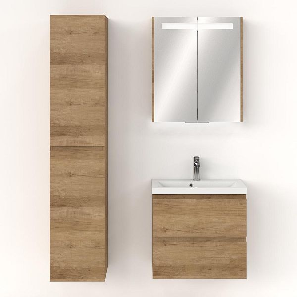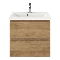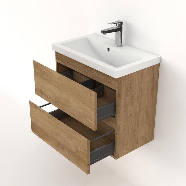 Ondiepe greeploos badkamermeubel in de kleur olm. Badmeubel is praktisch voor een compact badkamer. Het meubel van 60 cm breed is er. De wastafel is vervaardig in polystone en heeft de kleur wit. Dit badkamermeubel met deze wastafel is leverbaar tussen de 60 cm t/m 100 cm.
