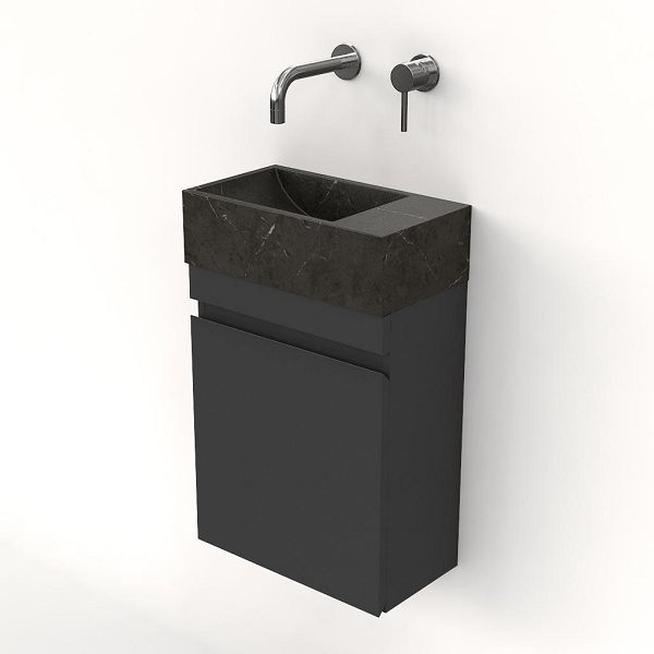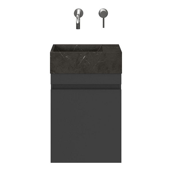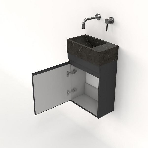 Greeploos fonteinmeubel in de kleur antraciet mat is 40 cm breed. De wastafel is vervaardig in natuursteen en heeft de kleur blue stone met 0 kraangaten