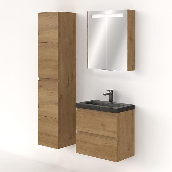 Ondiepe greeploos badkamermeubel in de kleur eiken natuur. Badmeubel is praktisch voor een compact badkamer. Het meubel van 60 cm breed is er. De wastafel is vervaardig in natuursteen en heeft de kleur blue stone. Dit badkamermeubel met deze wastafel is leverbaar tussen de 60 cm t/m 100 cm.