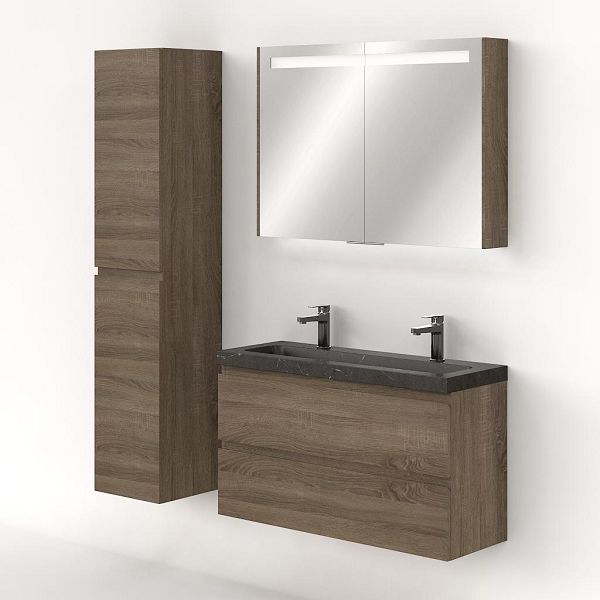 Ondiepe greeploos badkamermeubel in de kleur eiken donker. Badmeubel is praktisch voor een compact badkamer. Het meubel van 100 cm breed is er. De wastafel is vervaardig in natuursteen en heeft de kleur blue stone. Dit badkamermeubel met deze wastafel is leverbaar tussen de 60 cm t/m 100 cm.
