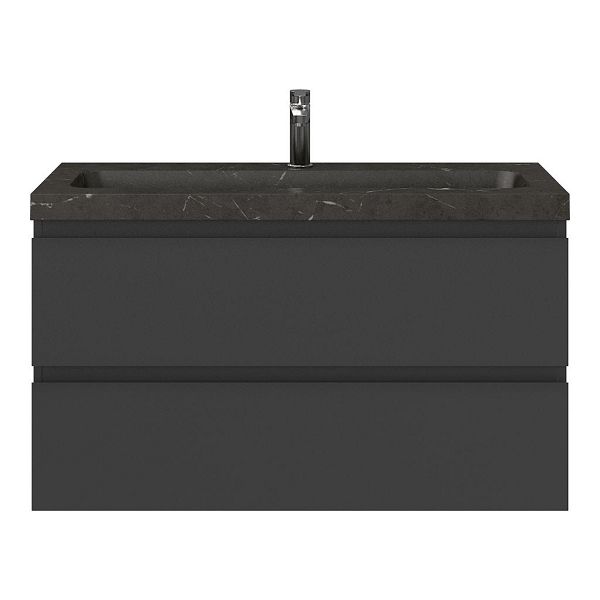 Ondiepe greeploos badkamermeubel in de kleur antraciet mat. Badmeubel is praktisch voor een compact badkamer. Het meubel van 100 cm breed is er. De wastafel is vervaardig in natuursteen en heeft de kleur blue stone. Dit badkamermeubel met deze wastafel is leverbaar tussen de 60 cm t/m 100 cm.