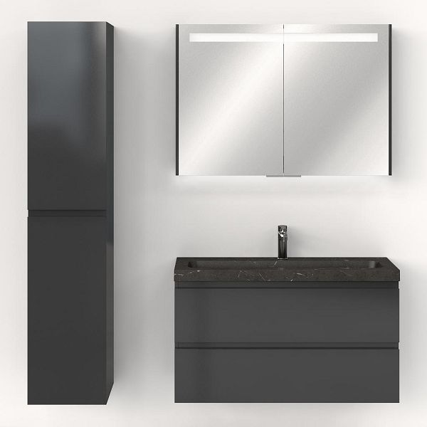 Ondiepe greeploos badkamermeubel in de kleur antraciet hoogglans. Badmeubel is praktisch voor een compact badkamer. Het meubel van 100 cm breed is er. De wastafel is vervaardig in natuursteen en heeft de kleur blue stone. Dit badkamermeubel met deze wastafel is leverbaar tussen de 60 cm t/m 100 cm.