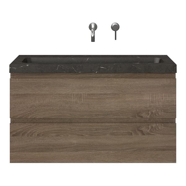 Ondiepe greeploos badkamermeubel in de kleur eiken donker. Badmeubel is praktisch voor een compact badkamer. Het meubel van 100 cm breed is er. De wastafel is vervaardig in natuursteen en heeft de kleur blue stone. Dit badkamermeubel met deze wastafel is leverbaar tussen de 60 cm t/m 100 cm.