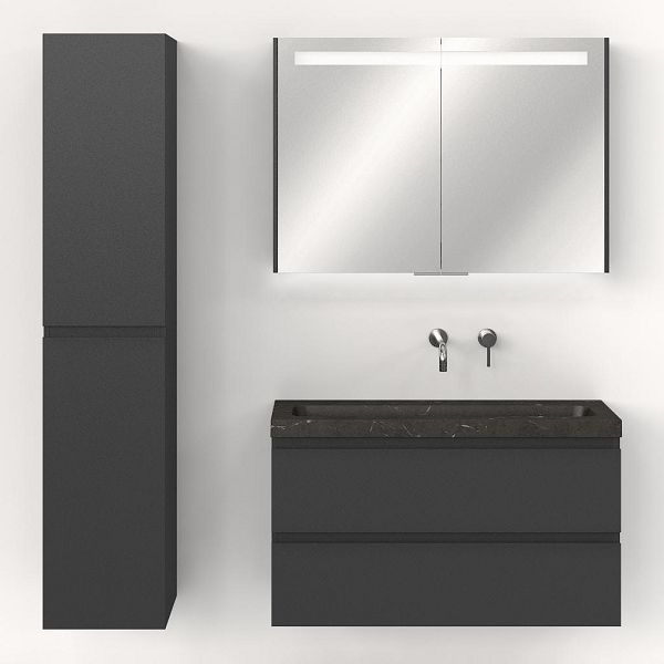 Ondiepe greeploos badkamermeubel in de kleur antraciet mat. Badmeubel is praktisch voor een compact badkamer. Het meubel van 100 cm breed is er. De wastafel is vervaardig in natuursteen en heeft de kleur blue stone. Dit badkamermeubel met deze wastafel is leverbaar tussen de 60 cm t/m 100 cm.