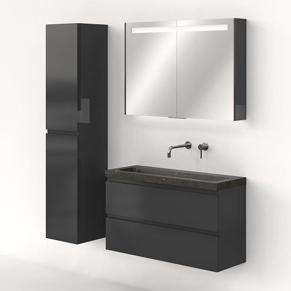 Ondiepe greeploos badkamermeubel in de kleur antraciet hoogglans. Badmeubel is praktisch voor een compact badkamer. Het meubel van 100 cm breed is er. De wastafel is vervaardig in natuursteen en heeft de kleur blue stone. Dit badkamermeubel met deze wastafel is leverbaar tussen de 60 cm t/m 100 cm.