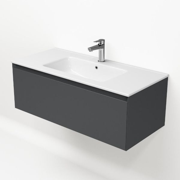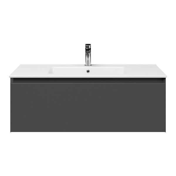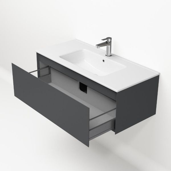 Greeploos badkamermeubel in de kleur antraciet mat is 100 cm breed. De wastafel is vervaardig in keramiek en heeft de kleur wit keramiek. Dit badkamermeubel met deze wastafel is leverbaar tussen de 60 cm t/m 120 cm