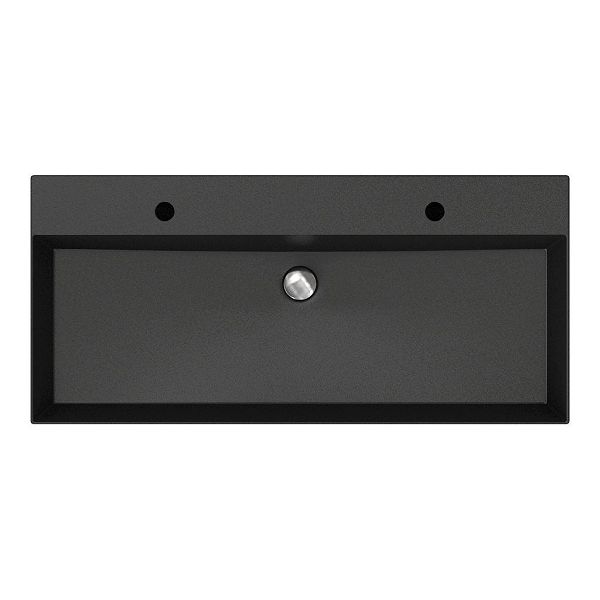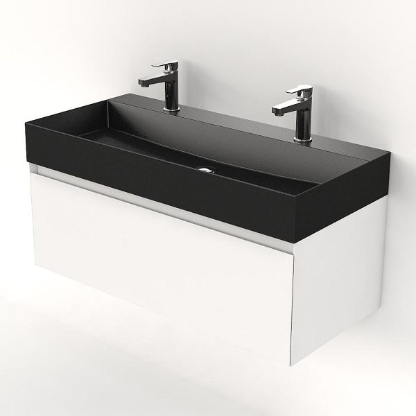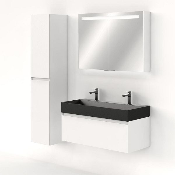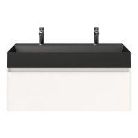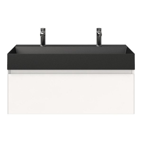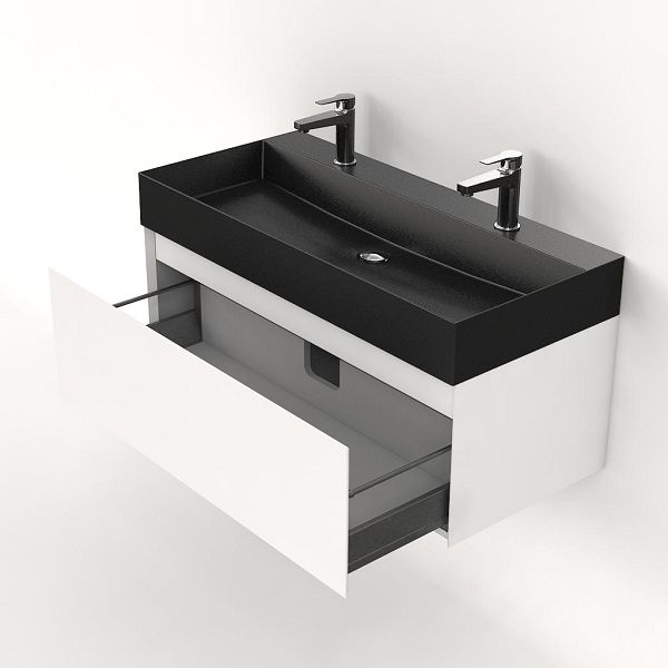 Greeploos badkamermeubel in de kleur wit mat is 100 cm breed.  De wastafel is vervaardig in keramiek en heeft de kleur antraciet mat keramiek. Dit badkamermeubel met deze wastafel is leverbaar tussen de 60 cm t/m 160 cm