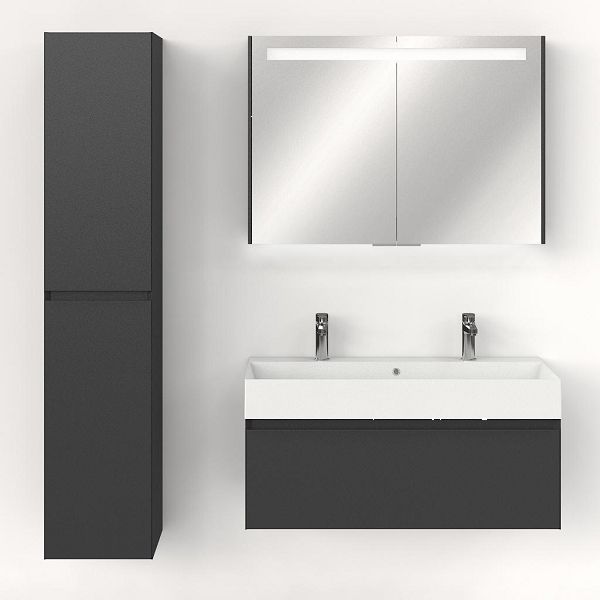 Greeploos badkamermeubel in de kleur antraciet mat is 100 cm breed.  De wastafel is vervaardig in keramiek en heeft de kleur wit mat keramiek. Dit badkamermeubel met deze wastafel is leverbaar tussen de 60 cm t/m 160 cm