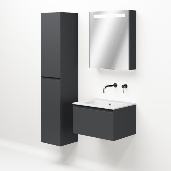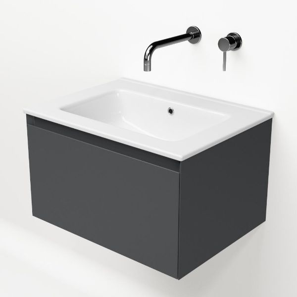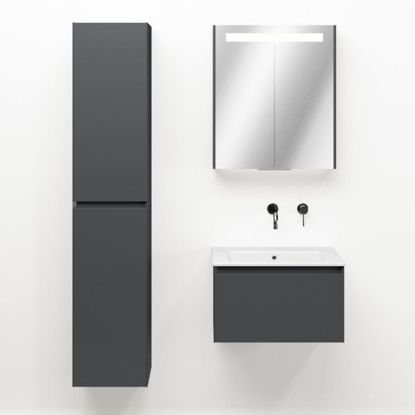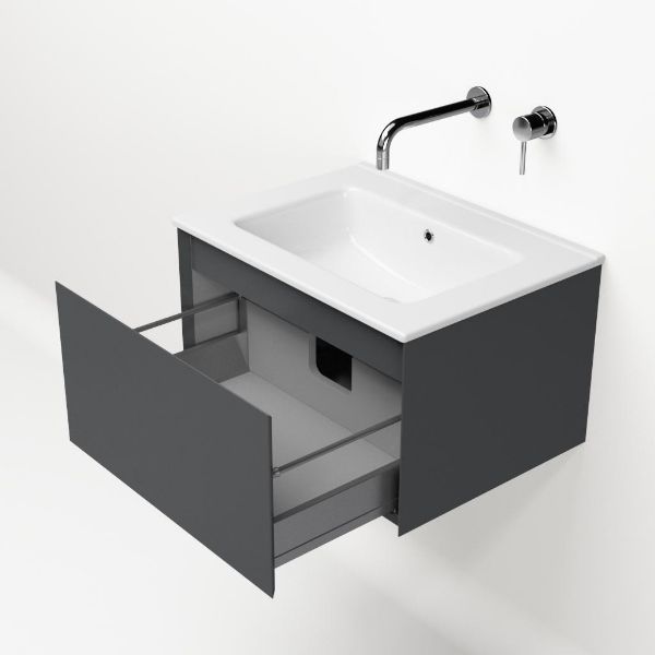 Greeploos badkamermeubel in de kleur antraciet mat is 60 cm breed. De wastafel is vervaardig in keramiek en heeft de kleur wit keramiek. Dit badkamermeubel met deze wastafel is leverbaar tussen de 60 cm t/m 120 cm