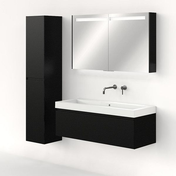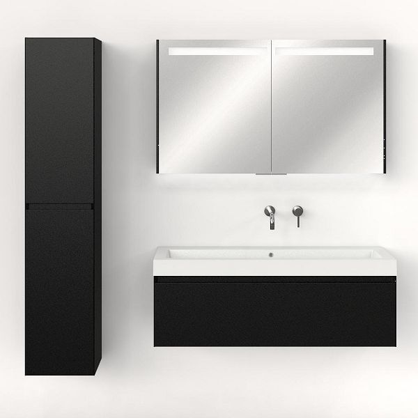 Greeploos badkamermeubel in de kleur zwart mat is 120 cm breed. De wastafel is vervaardig in polystone en heeft de kleur wit. Dit badkamermeubel met deze wastafel is leverbaar tussen de 60 cm t/m 160 cm