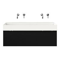 Greeploos badkamermeubel in de kleur zwart mat is 120 cm breed. De wastafel is vervaardig in keramiek en heeft de kleur wit mat keramiek. Dit badkamermeubel met deze wastafel is leverbaar tussen de 60 cm t/m 160 cm