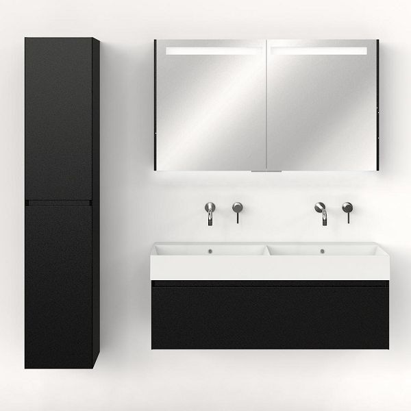 Greeploos badkamermeubel in de kleur zwart mat is 120 cm breed. De wastafel is vervaardig in keramiek en heeft de kleur wit keramiek. Dit badkamermeubel met deze wastafel is leverbaar tussen de 60 cm t/m 160 cm