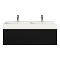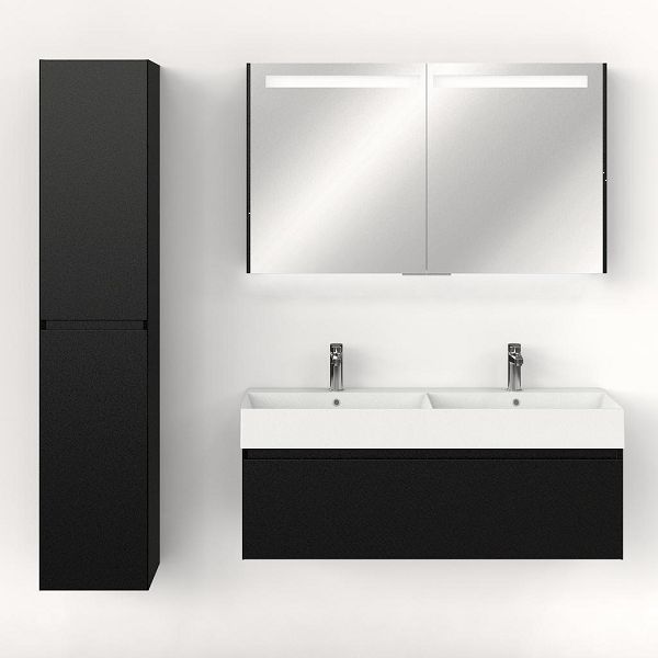 Greeploos badkamermeubel in de kleur zwart mat is 120 cm breed.  De wastafel is vervaardig in keramiek en heeft de kleur wit mat keramiek. Dit badkamermeubel met deze wastafel is leverbaar tussen de 60 cm t/m 160 cm