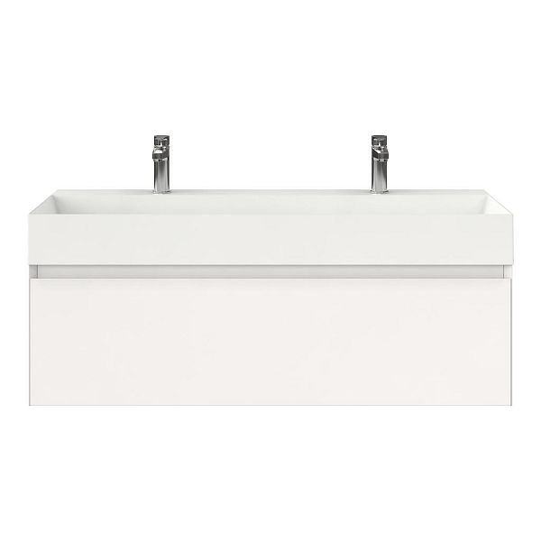 Greeploos badkamermeubel in de kleur wit hoogglans is 120 cm breed. De wastafel is vervaardig in keramiek en heeft de kleur wit keramiek. Dit badkamermeubel met deze wastafel is leverbaar tussen de 60 cm t/m 160 cm