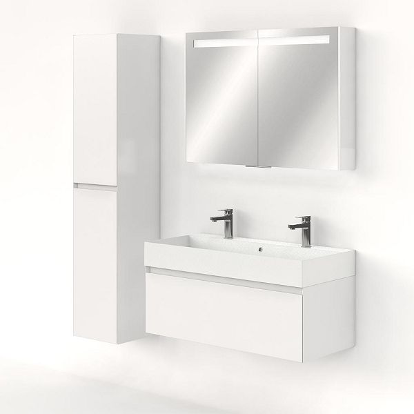 Greeploos badkamermeubel in de kleur wit hoogglans is 100 cm breed. De wastafel is vervaardig in keramiek en heeft de kleur wit mat keramiek. Dit badkamermeubel met deze wastafel is leverbaar tussen de 60 cm t/m 160 cm