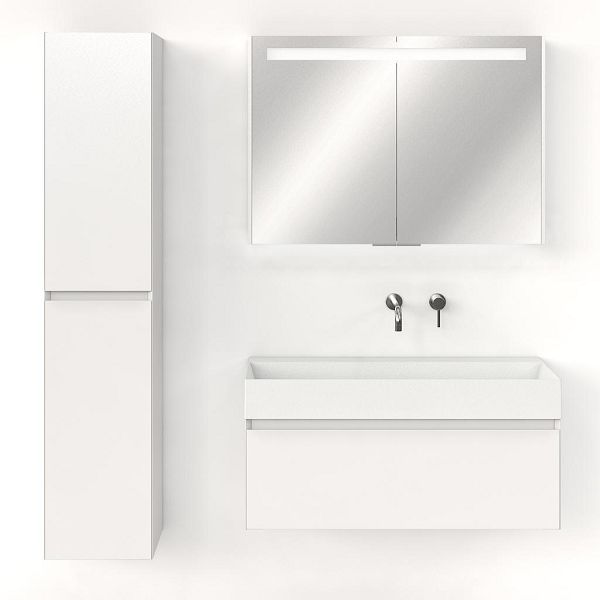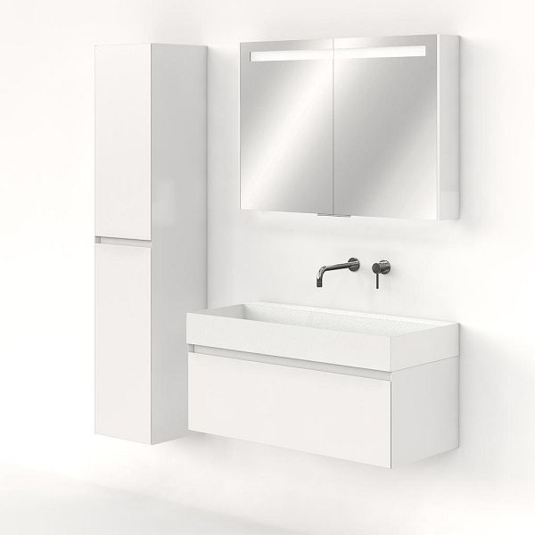Greeploos badkamermeubel in de kleur wit hoogglans is 100 cm breed. De wastafel is vervaardig in keramiek en heeft de kleur wit mat keramiek. Dit badkamermeubel met deze wastafel is leverbaar tussen de 60 cm t/m 160 cm