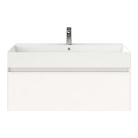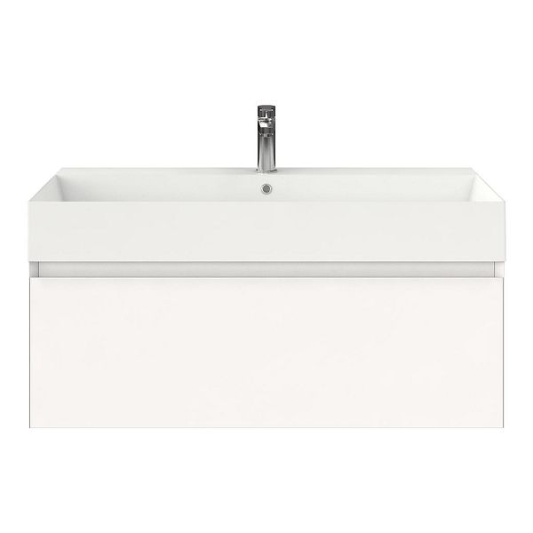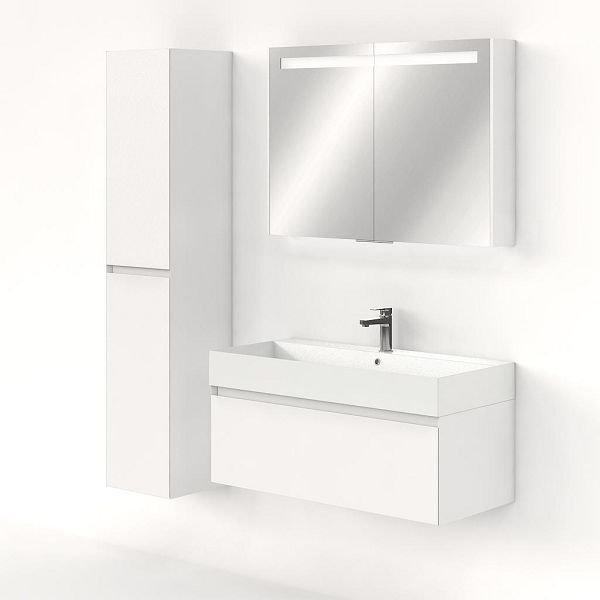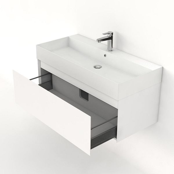 Greeploos badkamermeubel in de kleur wit mat is 100 cm breed.  De wastafel is vervaardig in keramiek en heeft de kleur wit keramiek. Dit badkamermeubel met deze wastafel is leverbaar tussen de 60 cm t/m 160 cm