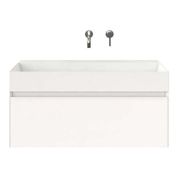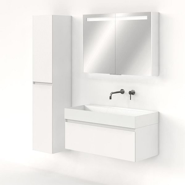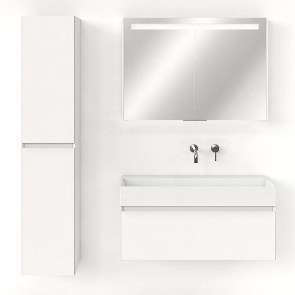 Greeploos badkamermeubel in de kleur wit mat is 100 cm breed. De wastafel is vervaardig in keramiek en heeft de kleur wit keramiek. Dit badkamermeubel met deze wastafel is leverbaar tussen de 60 cm t/m 160 cm