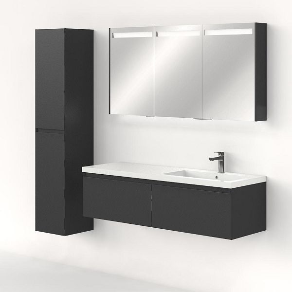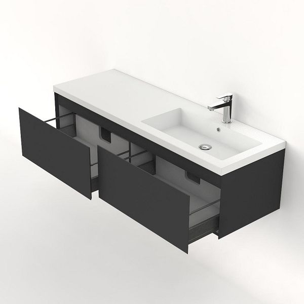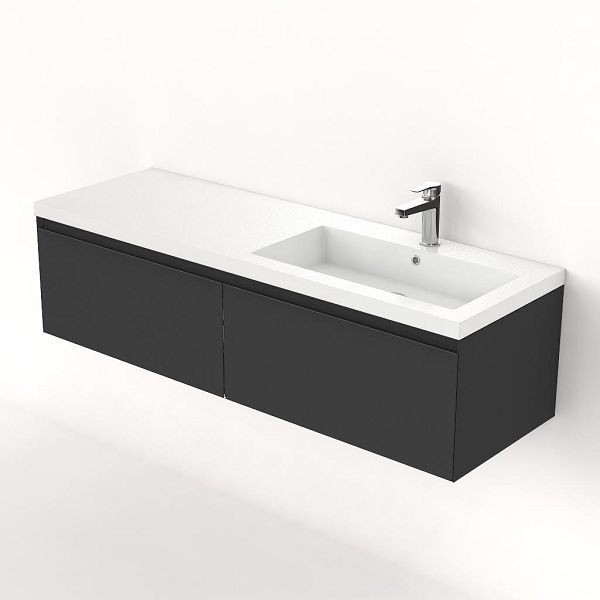 Greeploos badkamermeubel in de kleur antraciet mat is 140 cm breed.  De wastafel is vervaardig in polystone en heeft de kleur wit. Dit badkamermeubel met deze wastafel is leverbaar tussen de 60 cm t/m 160 cm
