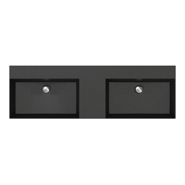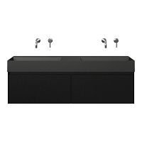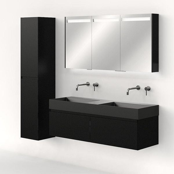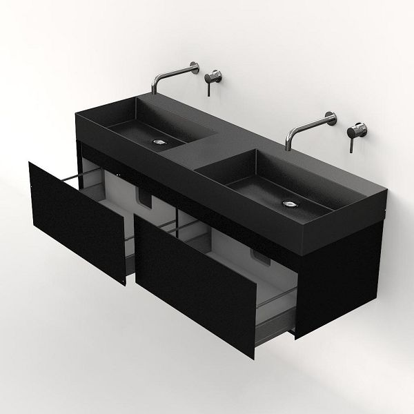 Greeploos badkamermeubel in de kleur zwart mat is 140 cm breed. De wastafel is vervaardig in keramiek en heeft de kleur antraciet mat keramiek. Dit badkamermeubel met deze wastafel is leverbaar tussen de 60 cm t/m 160 cm