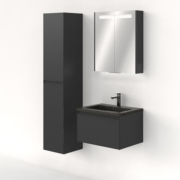 Greeploos badkamermeubel in de kleur antraciet mat is 60 cm breed. De wastafel is vervaardig in natuursteen en heeft de kleur blue stone. Dit badkamermeubel met deze wastafel is leverbaar tussen de 60 cm t/m 120 cm