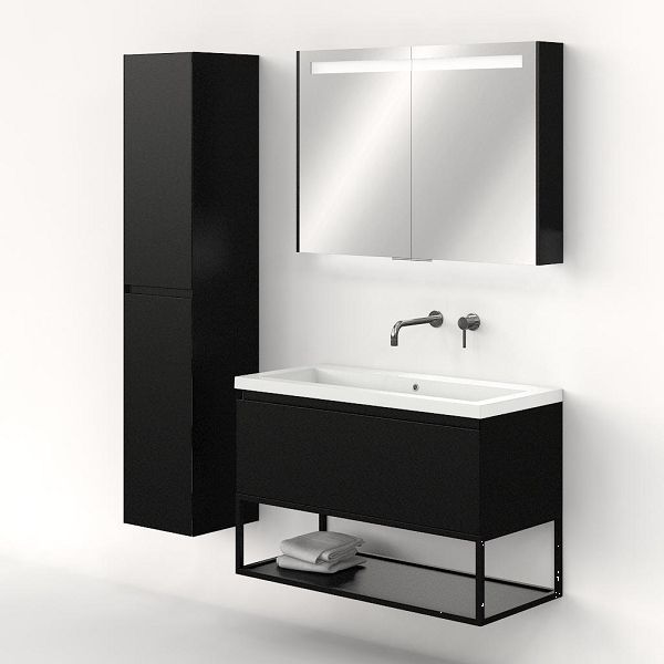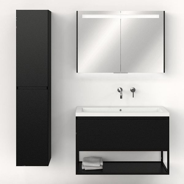 Greeploos badkamermeubel in de kleur zwart mat is 100 cm breed.  De wastafel is vervaardig in polystone en heeft de kleur wit. Dit badkamermeubel met deze wastafel is leverbaar tussen de 60 cm t/m 160 cm