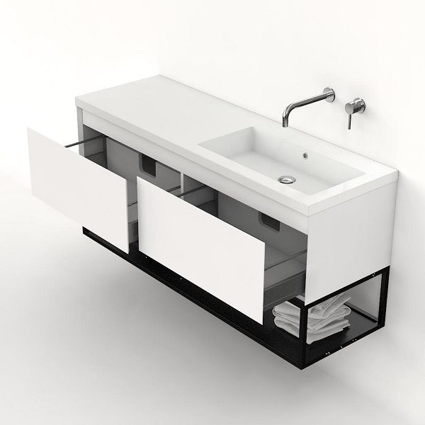| Bellanti Solo/Tela/Esta badmeubel 140x46 2 softclose laden wit hoogglans greeploos polystone wastafel wit zonder kraangaten met mat zwart metalen frame |