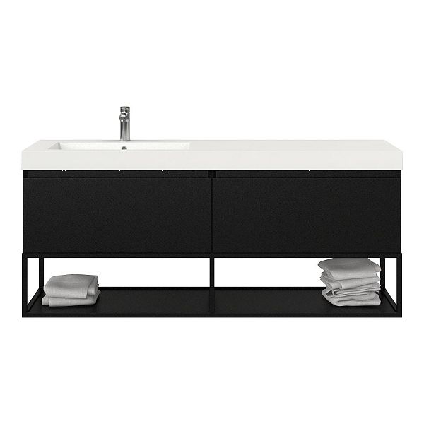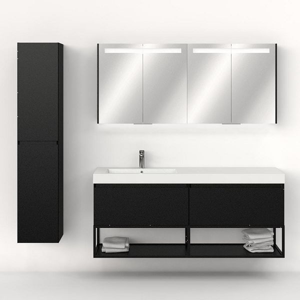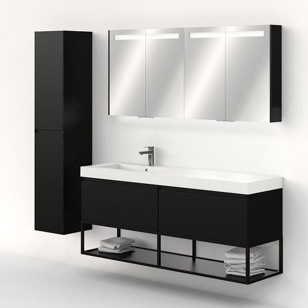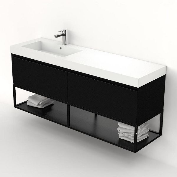 Greeploos badkamermeubel in de kleur zwart mat is 160 cm breed. De wastafel is vervaardig in polystone en heeft de kleur wit. Dit badkamermeubel met deze wastafel is leverbaar tussen de 60 cm t/m 160 cm