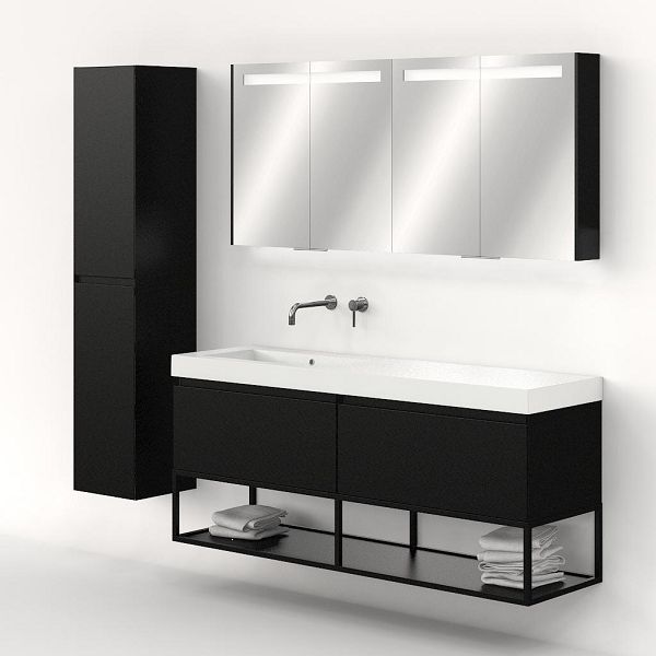 Greeploos badkamermeubel in de kleur zwart mat is 160 cm breed. De wastafel is vervaardig in polystone en heeft de kleur wit. Dit badkamermeubel met deze wastafel is leverbaar tussen de 60 cm t/m 160 cm